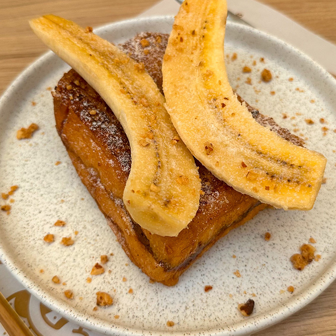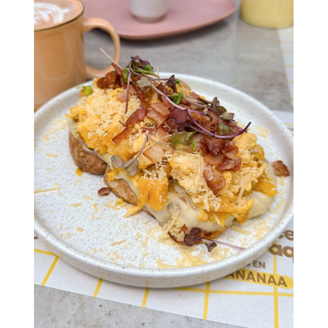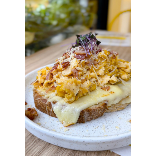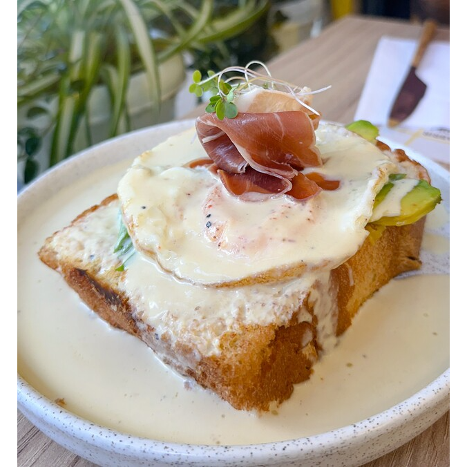 Tostada artesanal de pan brioche con aguacate, huevo, jamón serrano, bañada en salsa de queso y mostaza.