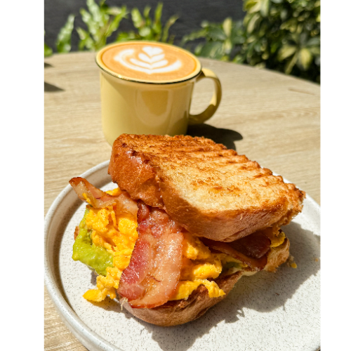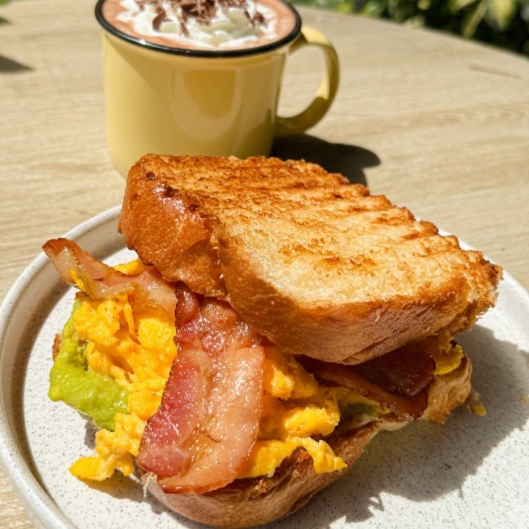 Sándwich de pan artesanal con huevo revuelto, tocineta crocante, aguacate y queso.