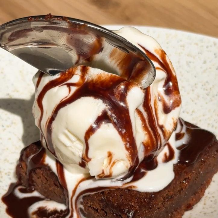 Brownie de chocolate con textura suave y centro húmedo, acompañado de helado de vainilla.