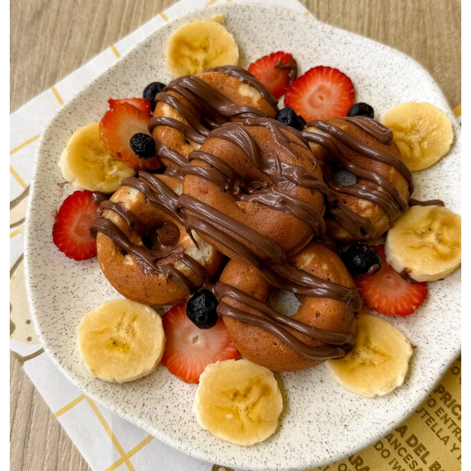 Mini donas de banano con Nutella, fruta fresca de banano, fresa y arándanos por 5 uds.