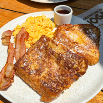 Huevos revueltos acompañados de 2 tostadas francesas, 2 tocinetas y syrup.