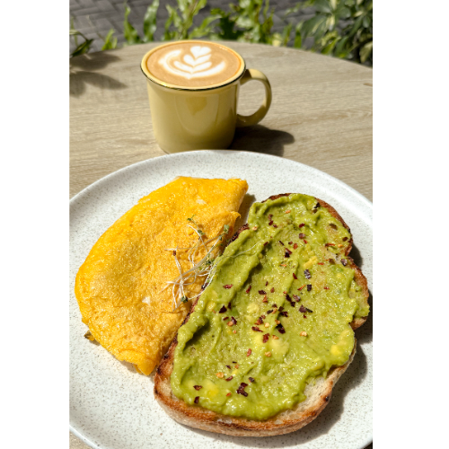 Omelette de maduro con queso suave acompañado con tostada de pan de masa madre, crema de aguacate y un toque de pimienta.