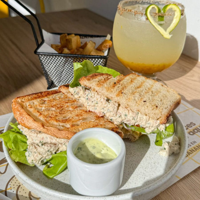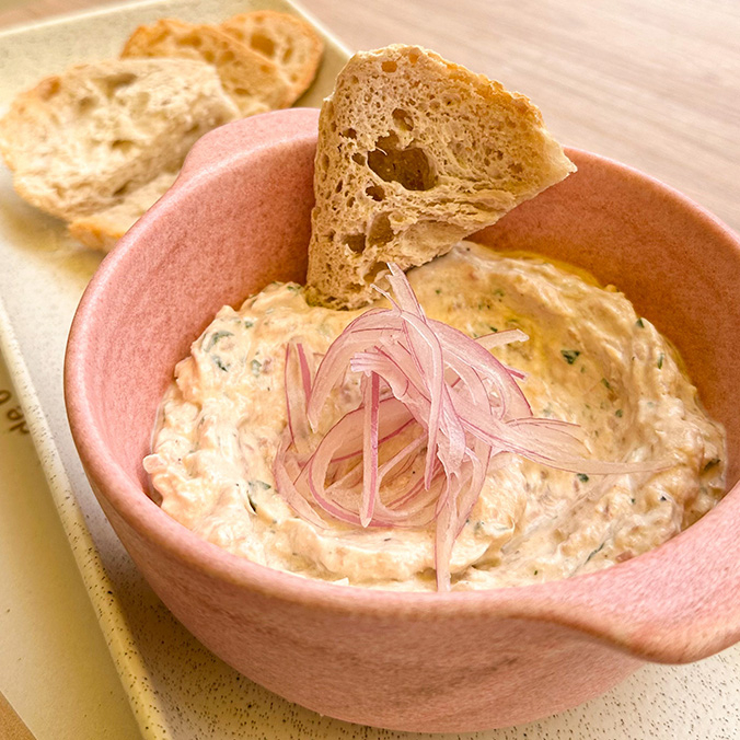 Cremoso con mezcla de queso, atún, cebolla con un toque cítrico y pan de masa madre crocante.