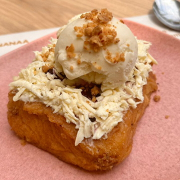 Tostada francesa con queso rallado, mermelada de frutos rojos y helado de banano y praline.