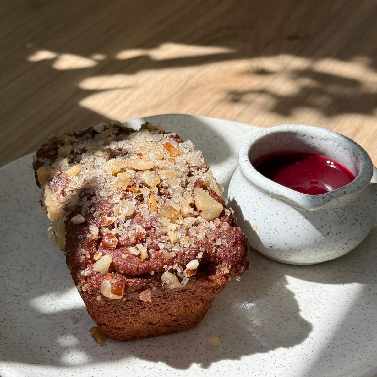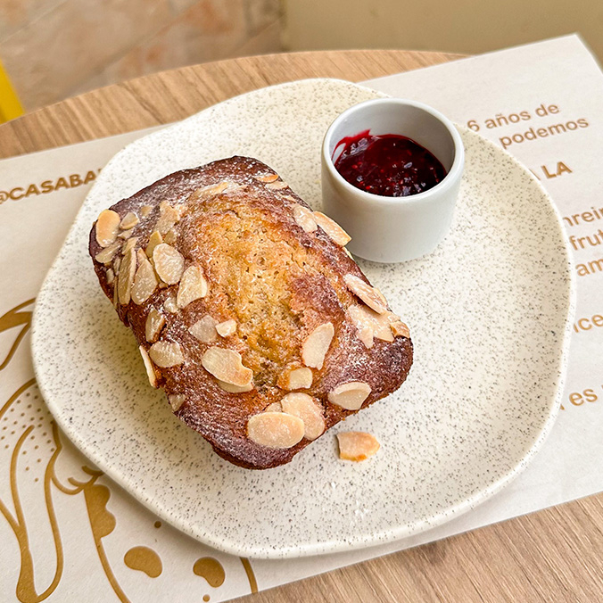 Bebé esponjosa de banano con frutos secos y mermelada de frutos rojos.