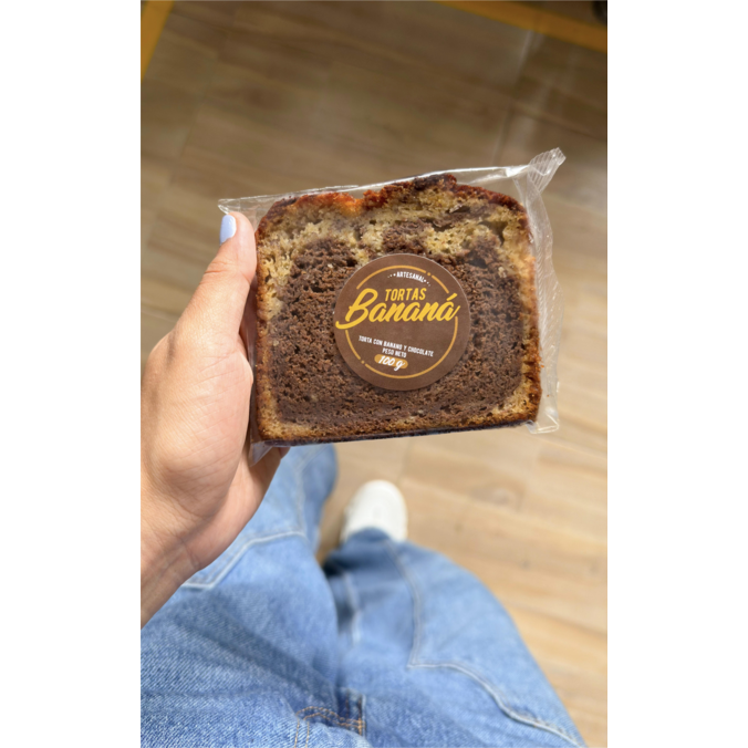 100 g De torta artesanal de banano con chocolate, libre de colorantes y saborizantes, contiene fruta según disponibilidad.