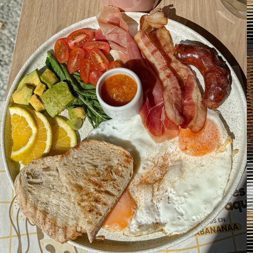 Desayuno con tocineta, chorizo santarosano, aguacate fresco, tomate cherry, lechuga, rugula, jamón serrano, rodajas de naranja, huevos fritos y pan de masa madre.