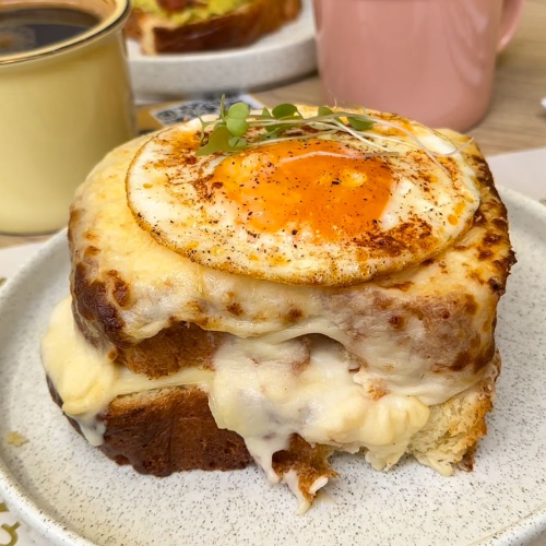 Sándwich con pan brioche artesanal, jamón, queso derretido, salsa bechamel y huevo frito.