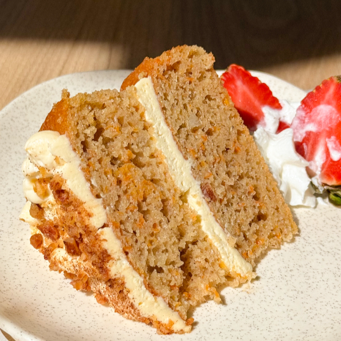 Torta zanahoria con nueces y canela, acompañada de salsa de queso, 1 porción.