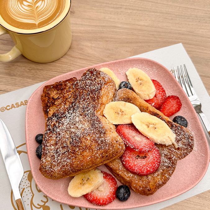 Tostadas francesas por 2 unidades acompañadas con miel y fruta fresca de temporada.
