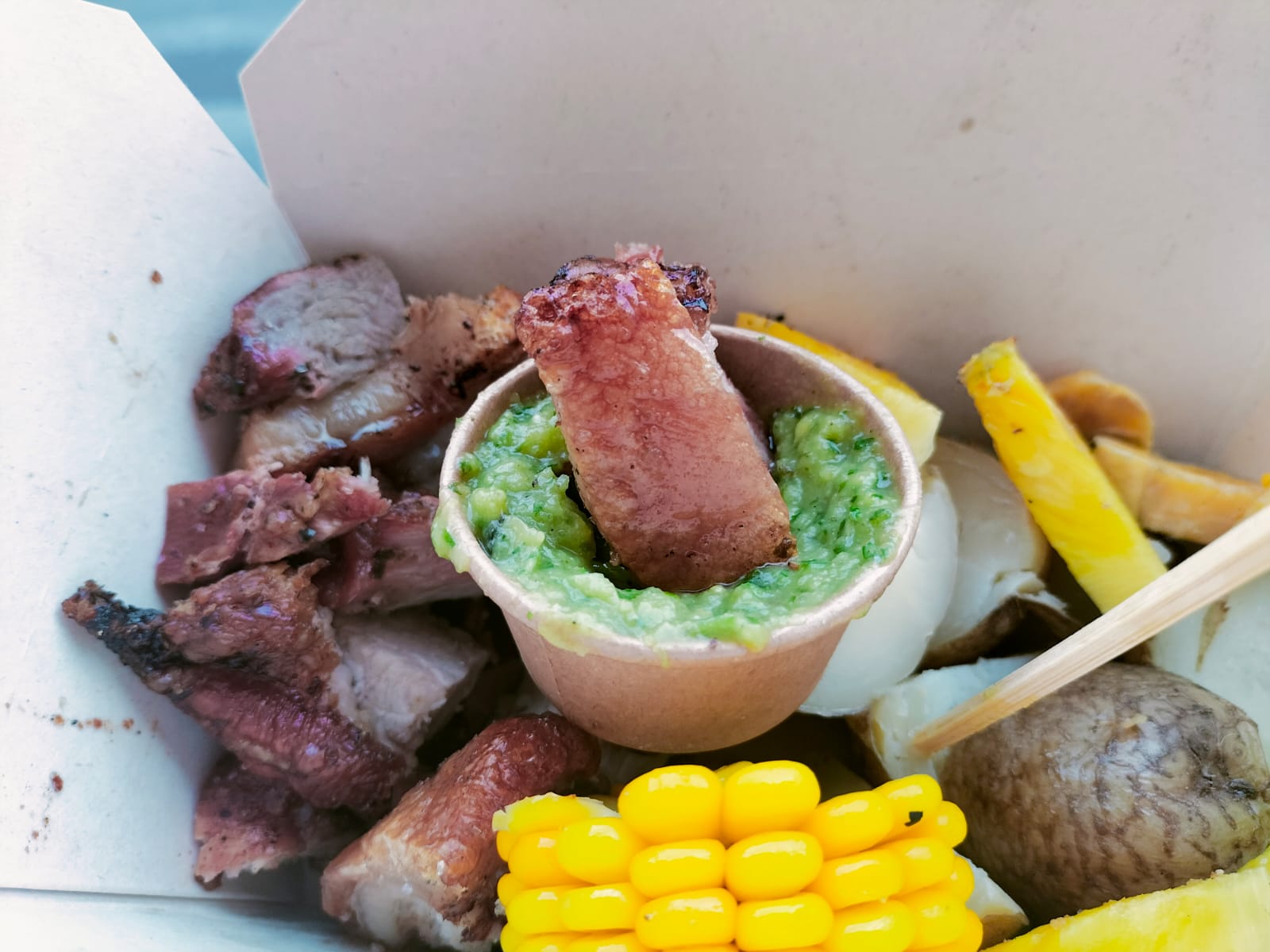 Deliciosa Porchetta de cerdo al barril de 250gr (personal) acompañado de papa cocida, mazorca, queso, guacamole y plátano cocido.
