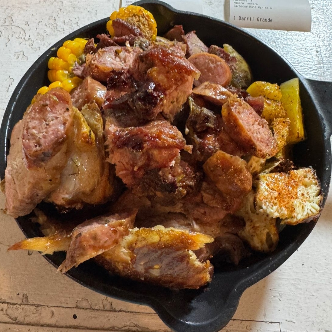 Deliciosa Carne de res al barril de 250gr (personal) acompañado de papa cocida, mazorca, queso, guacamole y plátano cocido.