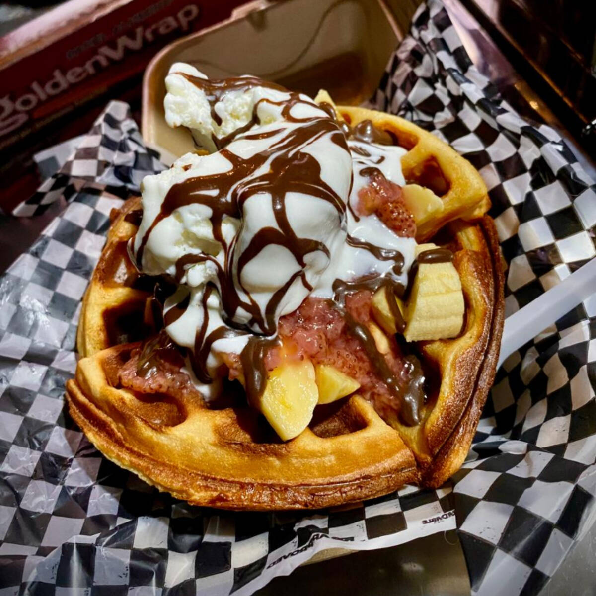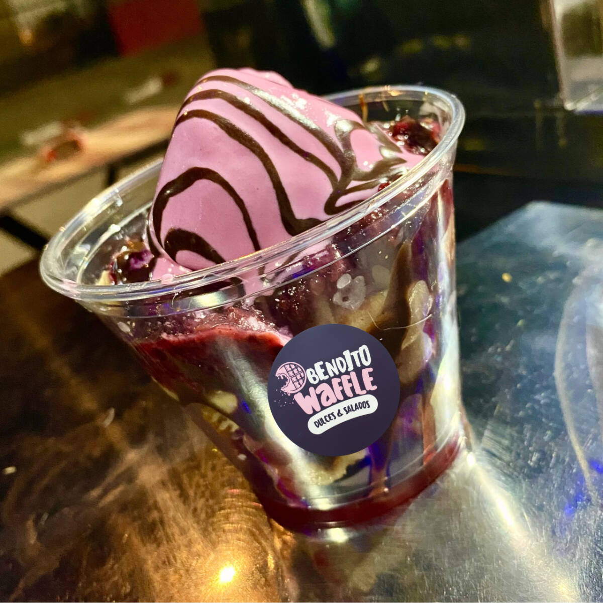 Delicioso waffle artesanal acompañado de banano picado, helado a elección, fruta a elección, salsa a elección y topping a elección.