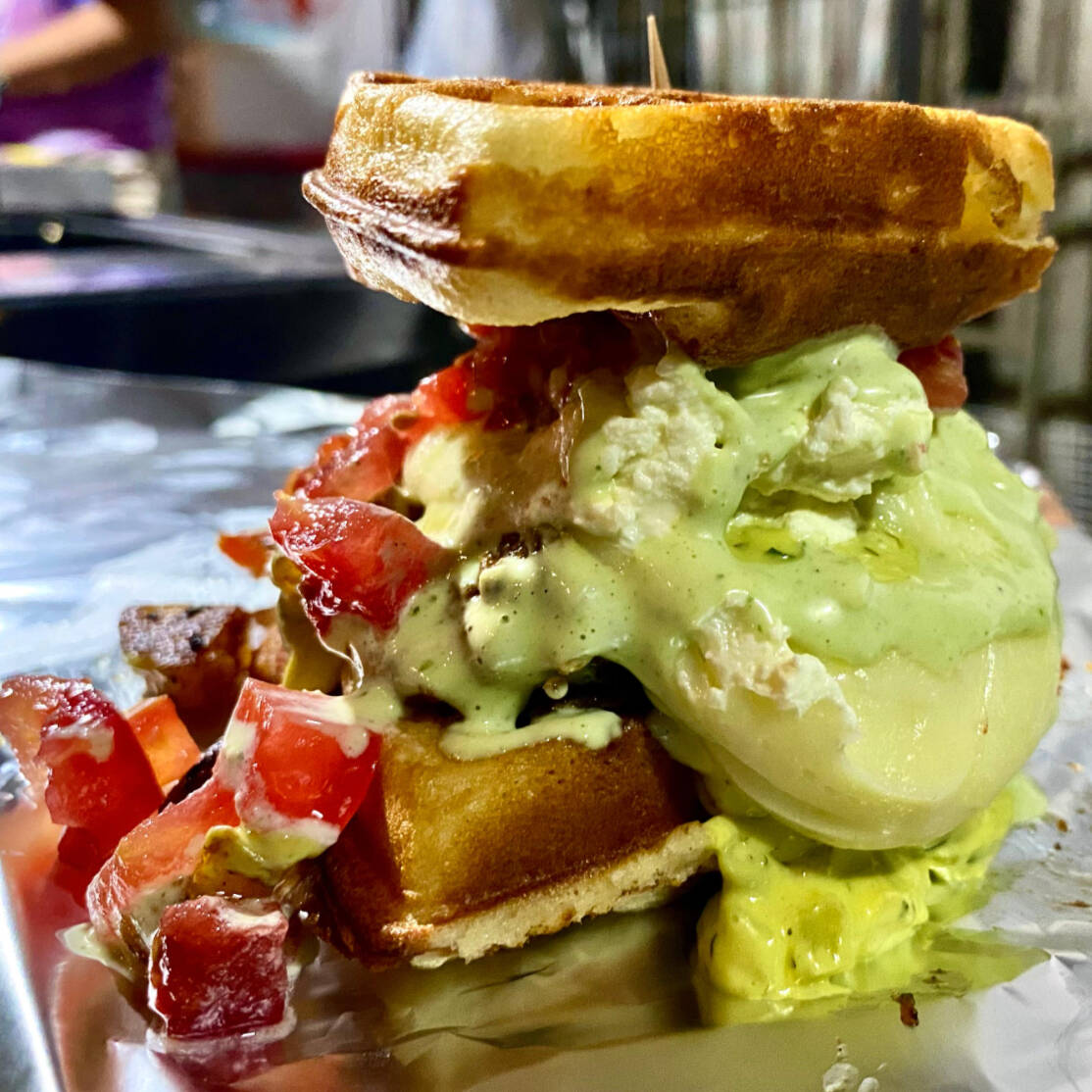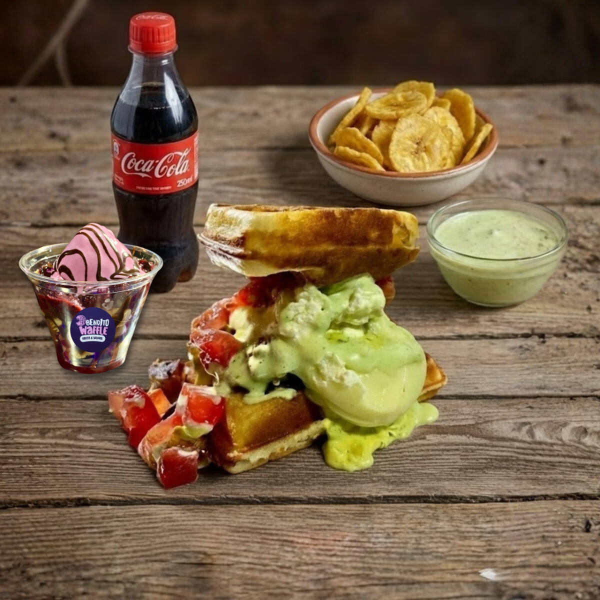 Waffle artesanal acompañado de carne de res desmechada, tocineta crunch, maduro, guacamole, queso mozzarella, queso crema, tomate y salsa de la casa.