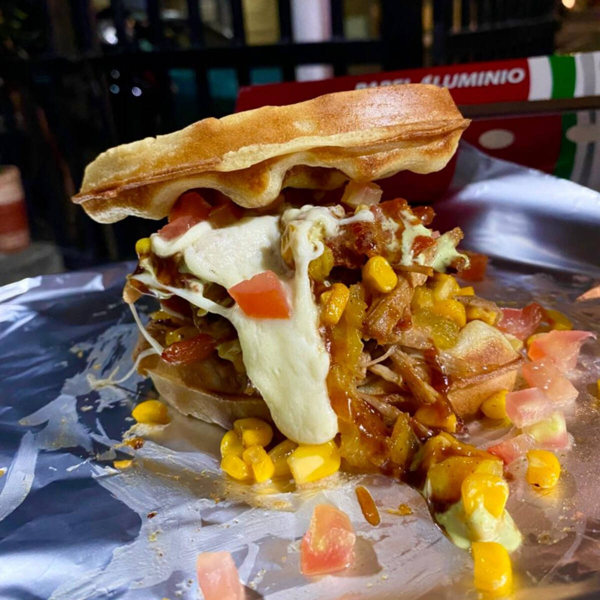 Waffle artesanal acompañado de cerdo BBQ miel desmechado, tocineta crunch, piña calada, maíz tierno, queso mozzarella, tomate y salsa de la casa.