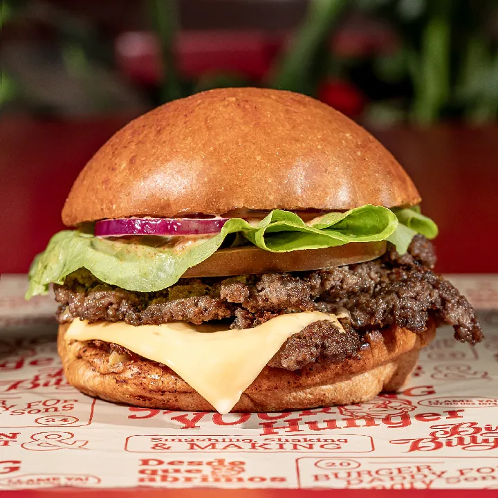 2 Carnes angus (200 gr entre la dos ), queso americano, tomate, cebolla, lechuga, salsa de la casa y pan.