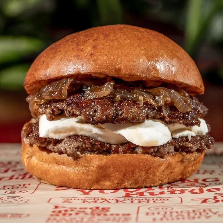 2 Carnes angus (200 g entre dos ), queso philadelphia, cebolla caramelizada, salsa de la casa y pan.