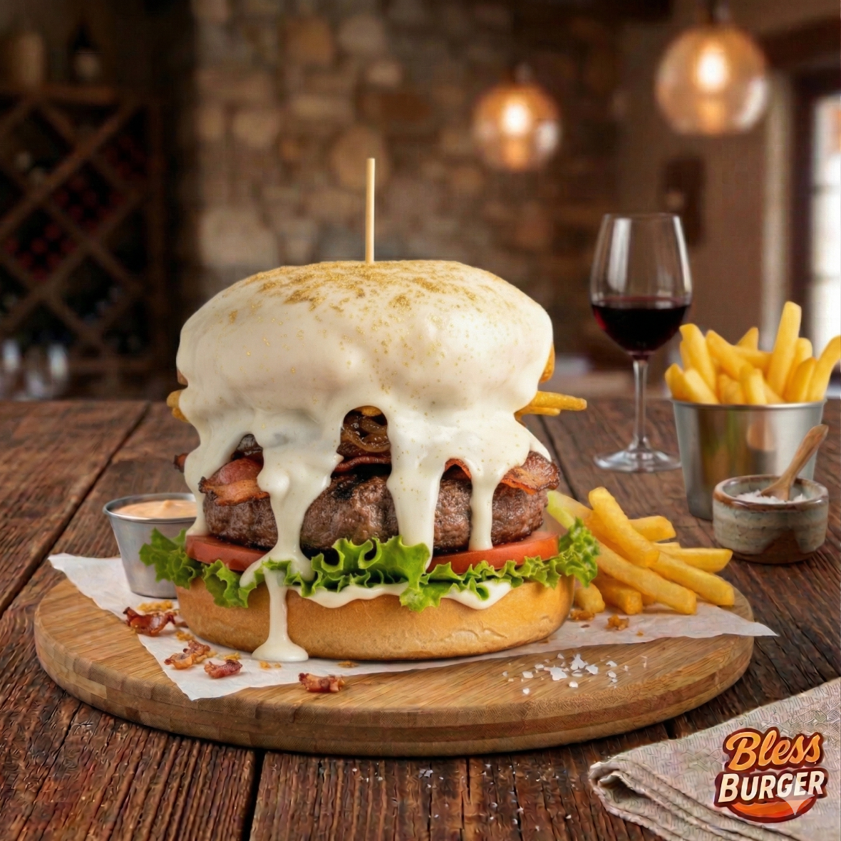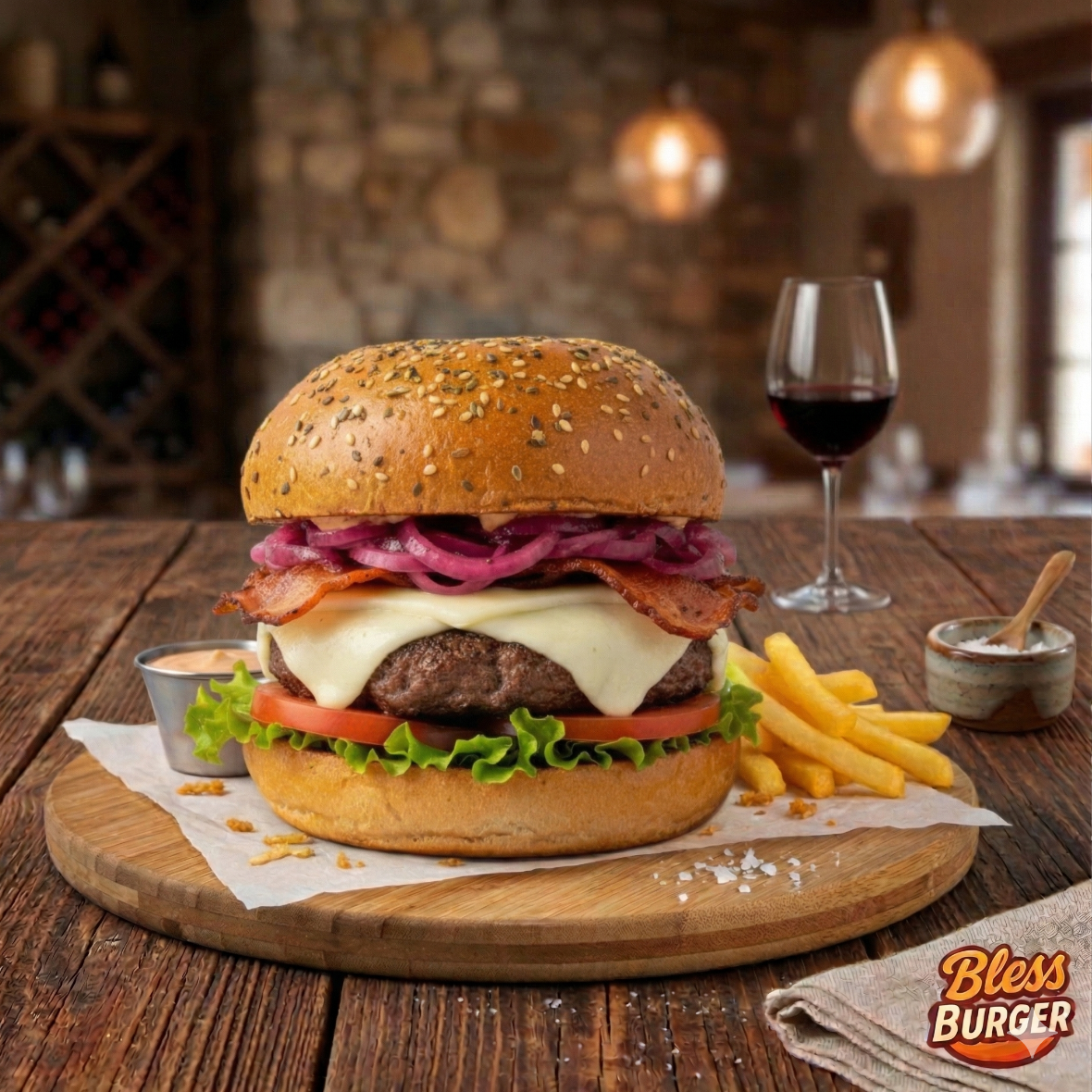 1945 y 1964 - PARA LOS EXPERIMENTADOS Y DETALLISTAS! Carne de res Cebú 140 grs, pan de orégano, tocino ahumado, ripio de papa, cebolla caramelizada, lechuga crespa, 160 grs de queso doble crema fundido enchapado en oro, papas a la francesa y la deliciosa salsa Blessed.
