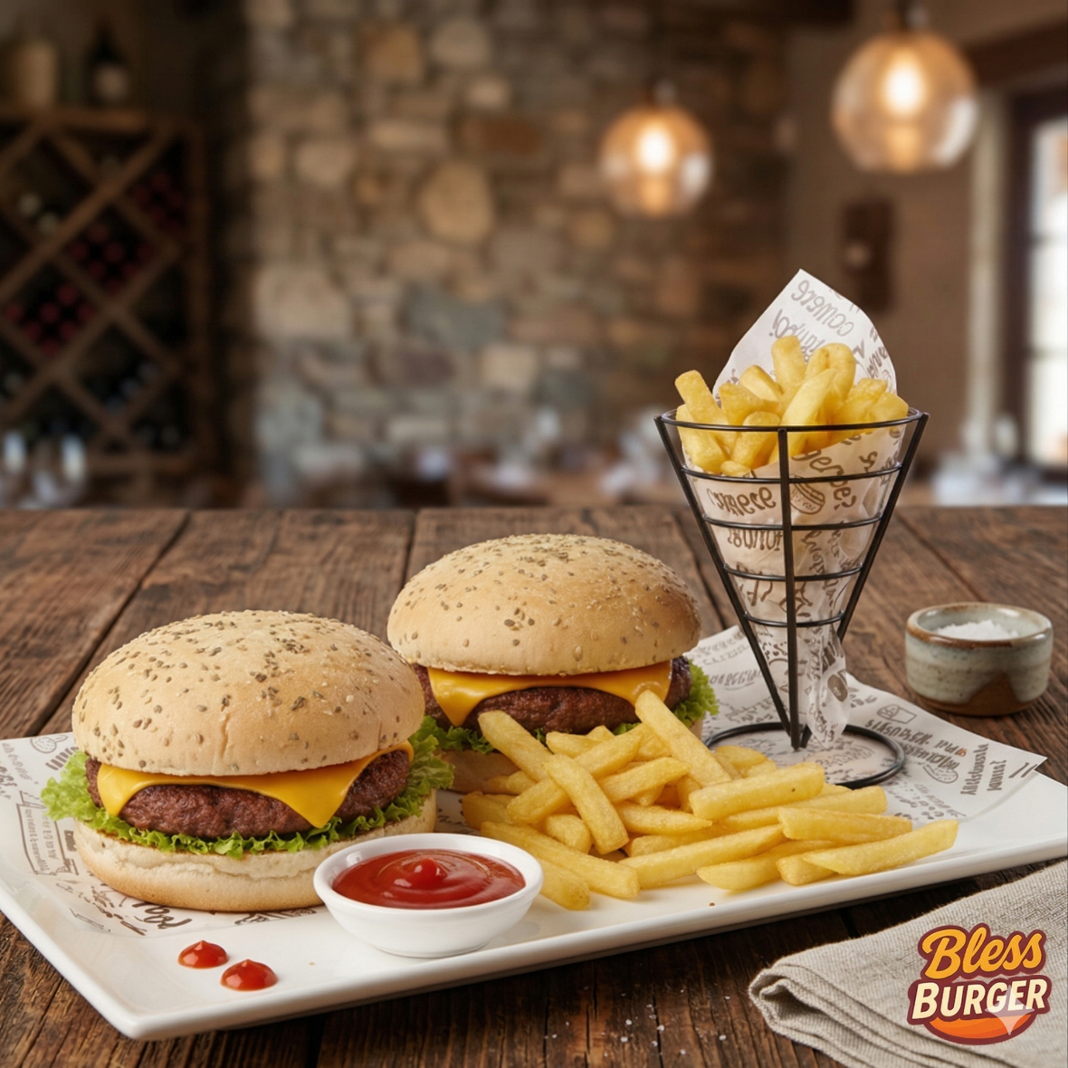 2 Hamburguesas Clasic Burger con carne de res nacional acompañado con papas a la francesa para 2 personas y la deliciosa salsa Blessed.