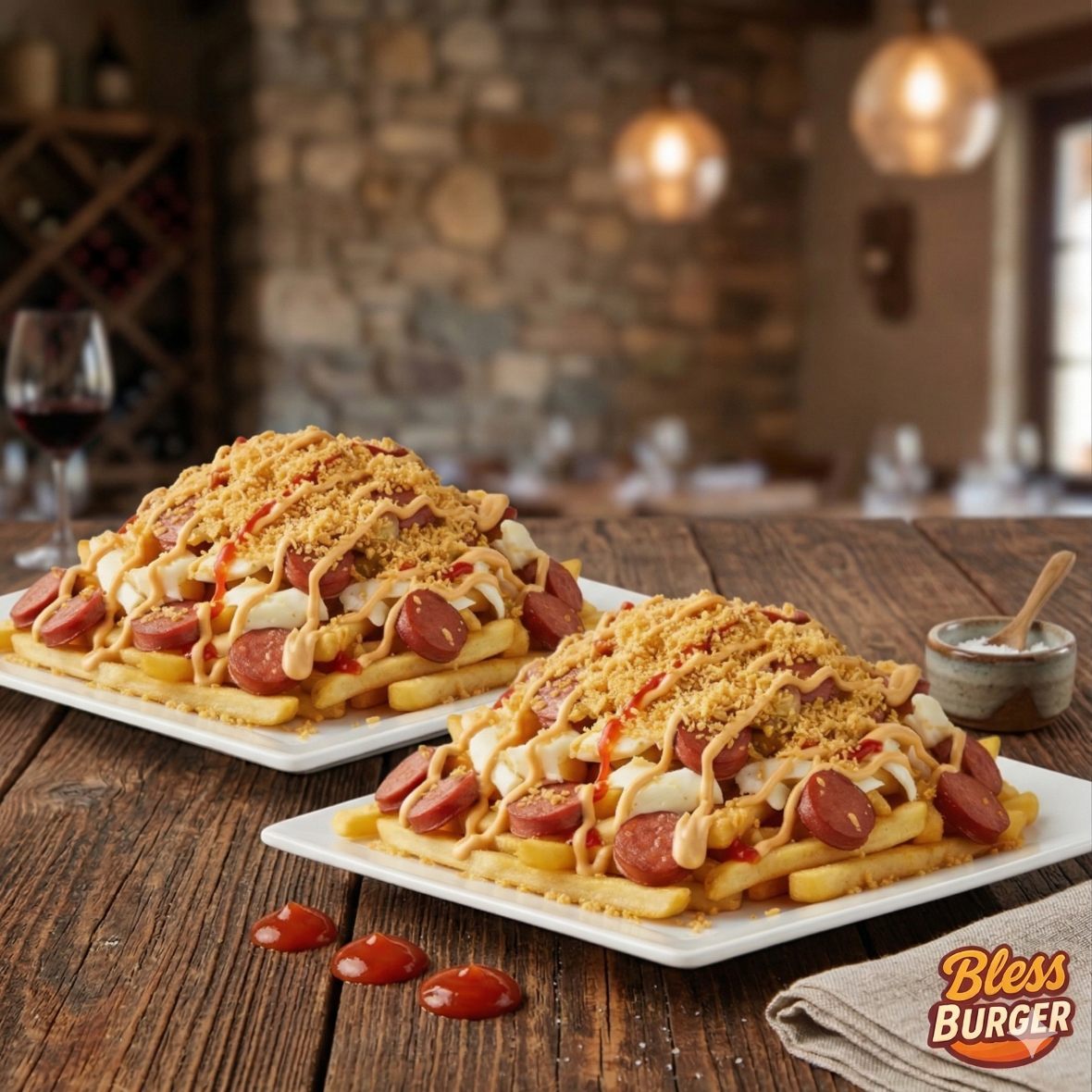 2 Salchipapas de tamaño personal con papas a la francesa, salchicha, ripio de papa, queso mozarella en drilas y la deliciosa salsa Blessed.