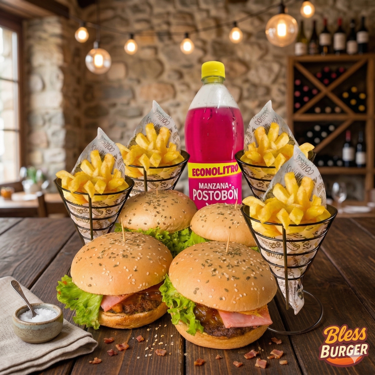 Precio especial en combo familiar de 4 hamburguesas clásicas con carne nacional y tocineta ahumada, 4 porciones de papas a la francesa y una gaseosa de 1lts para los 4 (sabor disponible).