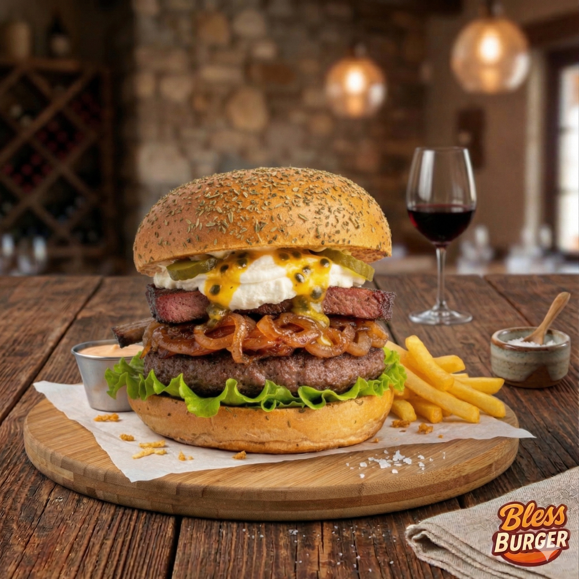 1982 Y 1994 - PARA LOS QUE COMEN SIN PELOS EN LA LENGUA! Carne Angus 140 grs, pan artesanal de orégano, quesillo, costilla carnuda, pepinillos dulces, cebolla caramelizada, salsa de maracuyá, lechuga fresca, papas a la francesa y salsa Blessed.