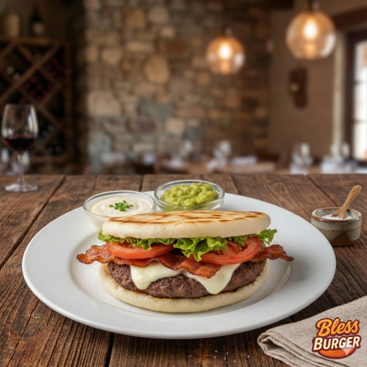 La fusión perfecta entre hamburguesa y arepa. Carne jugosa de 140 gr, tocineta crujiente, queso mozzarella fundido, lechuga crespa, cebolla caramelizada, tomate fresco y nuestras deliciosas salsas.