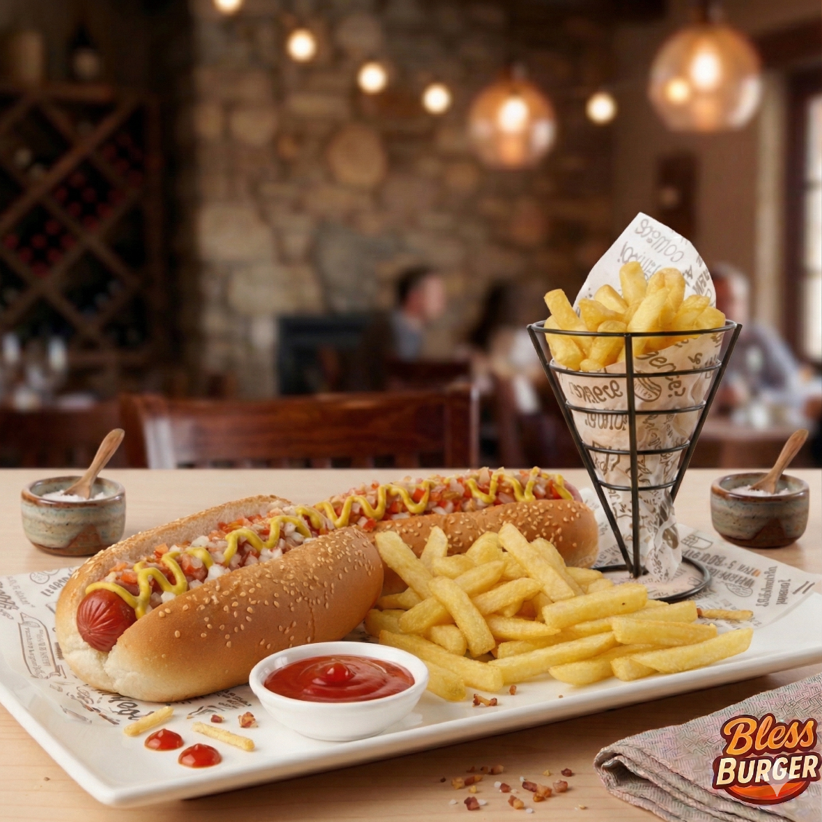 2 super Perros Calientes con pan brioche, salchicha Rica, queso mozzarella, ripio de papa, salsas y acompañado con papas a la francesa para 2 personas y la deliciosa salsa Blessed.