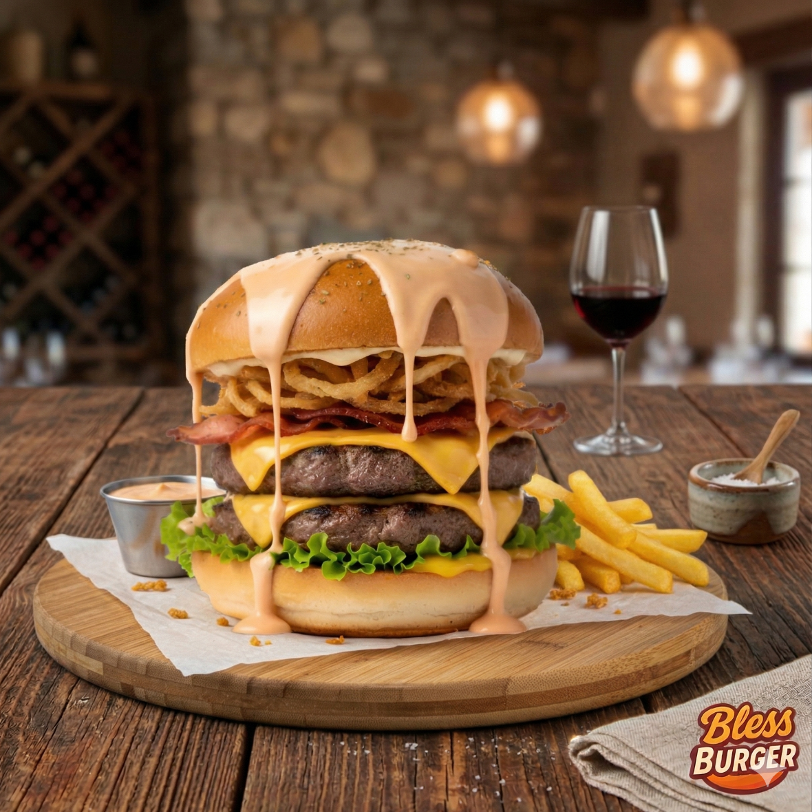 1995 Y 2009 - PARA LOS QUE NO LES IMPORTA NADA A LA HORA DE COMER! Doble carne Angus 200 grs, pan artesanal de orégano, doble queso cheddar, doble tocino ahumado pork, cebolla crispy, salsa de maracuyá, lechuga fresca, papas a la francesa y salsa Blessed.