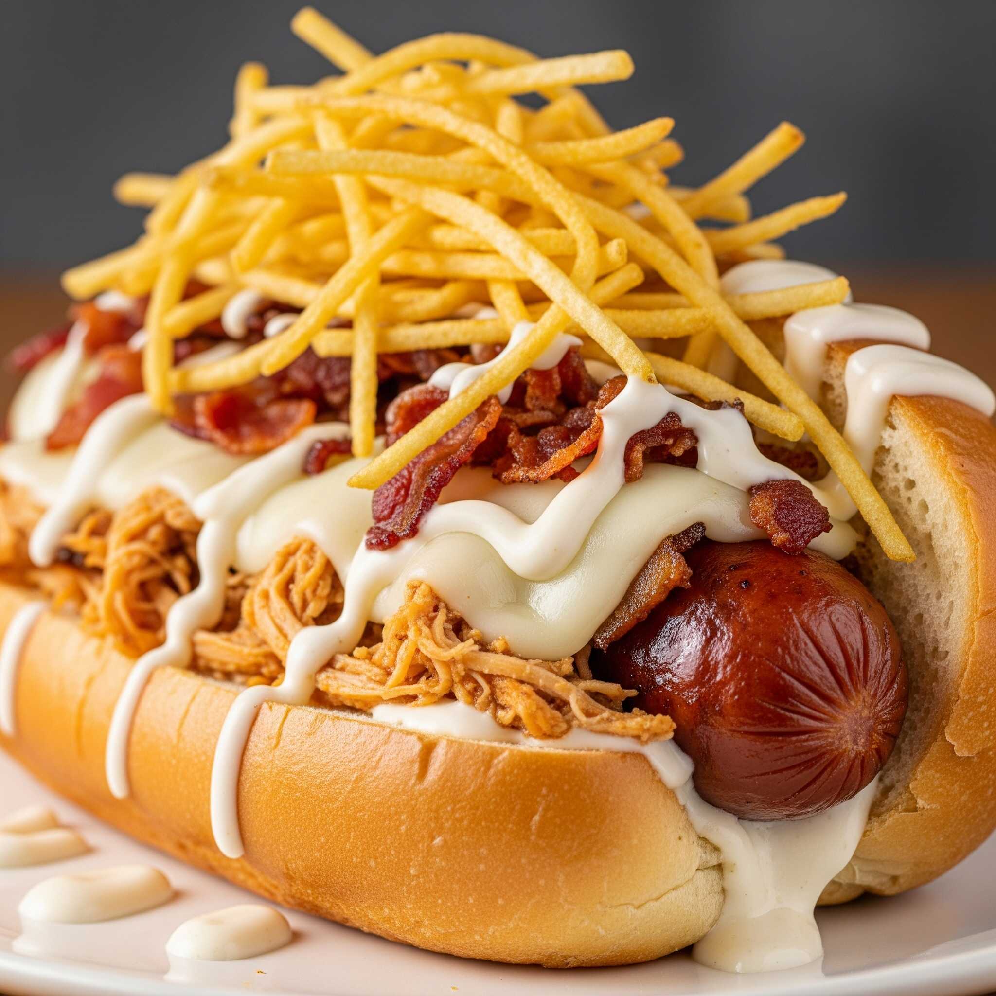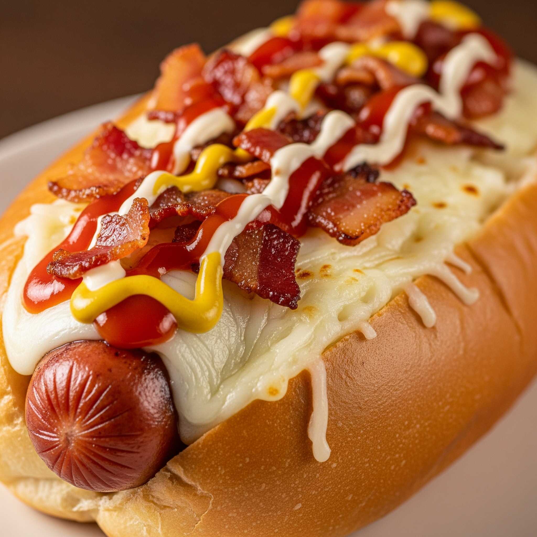 Salchicha americana, tocineta, queso, ripio, salsas.