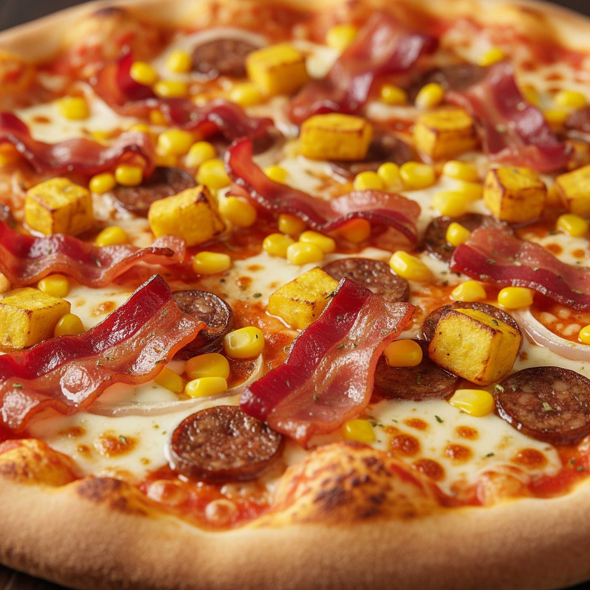 Pizza personal con tocineta, maduro, maíz, salchicha ahumada, queso.