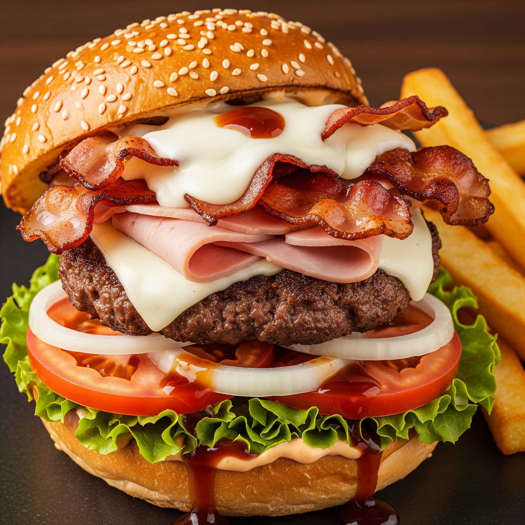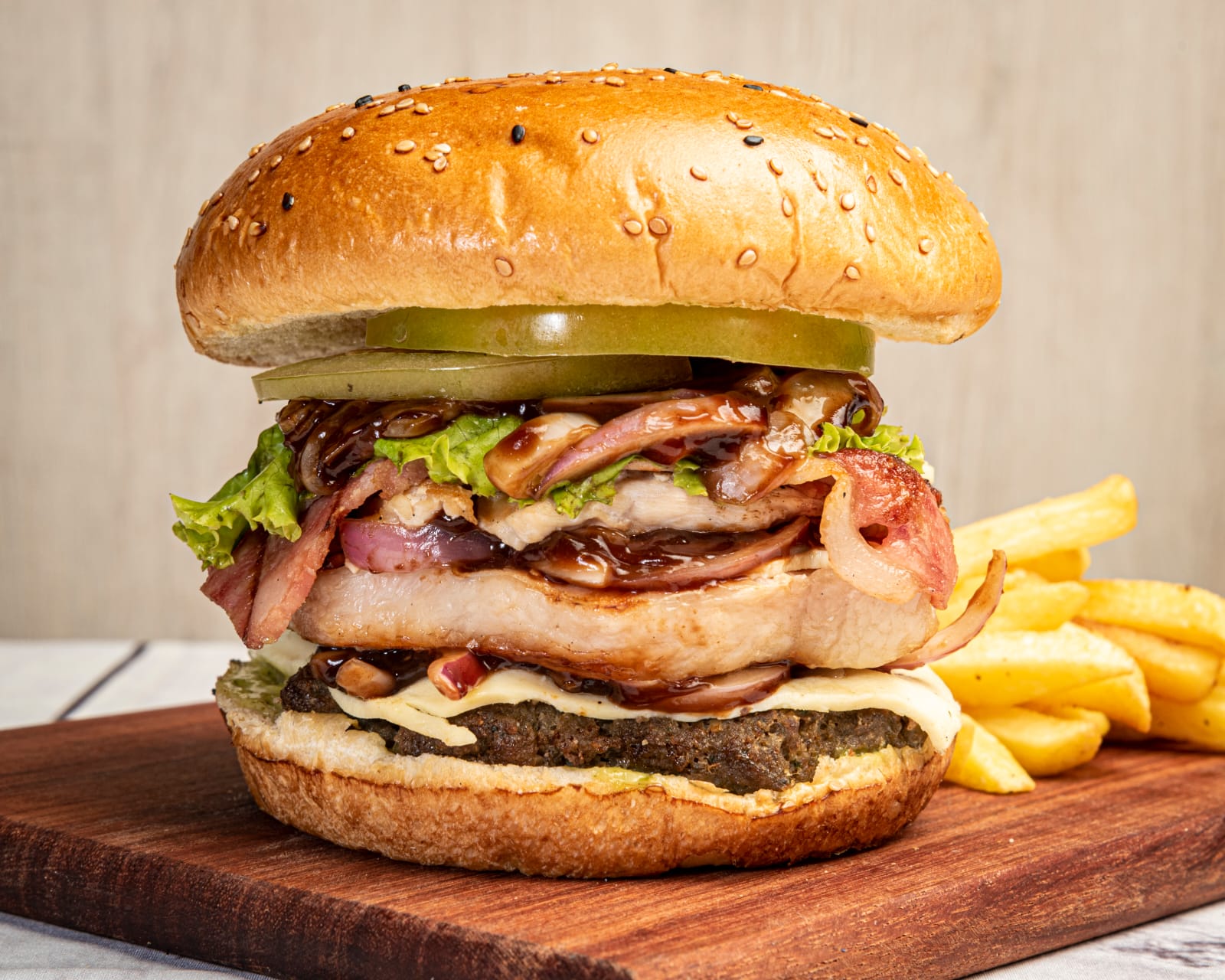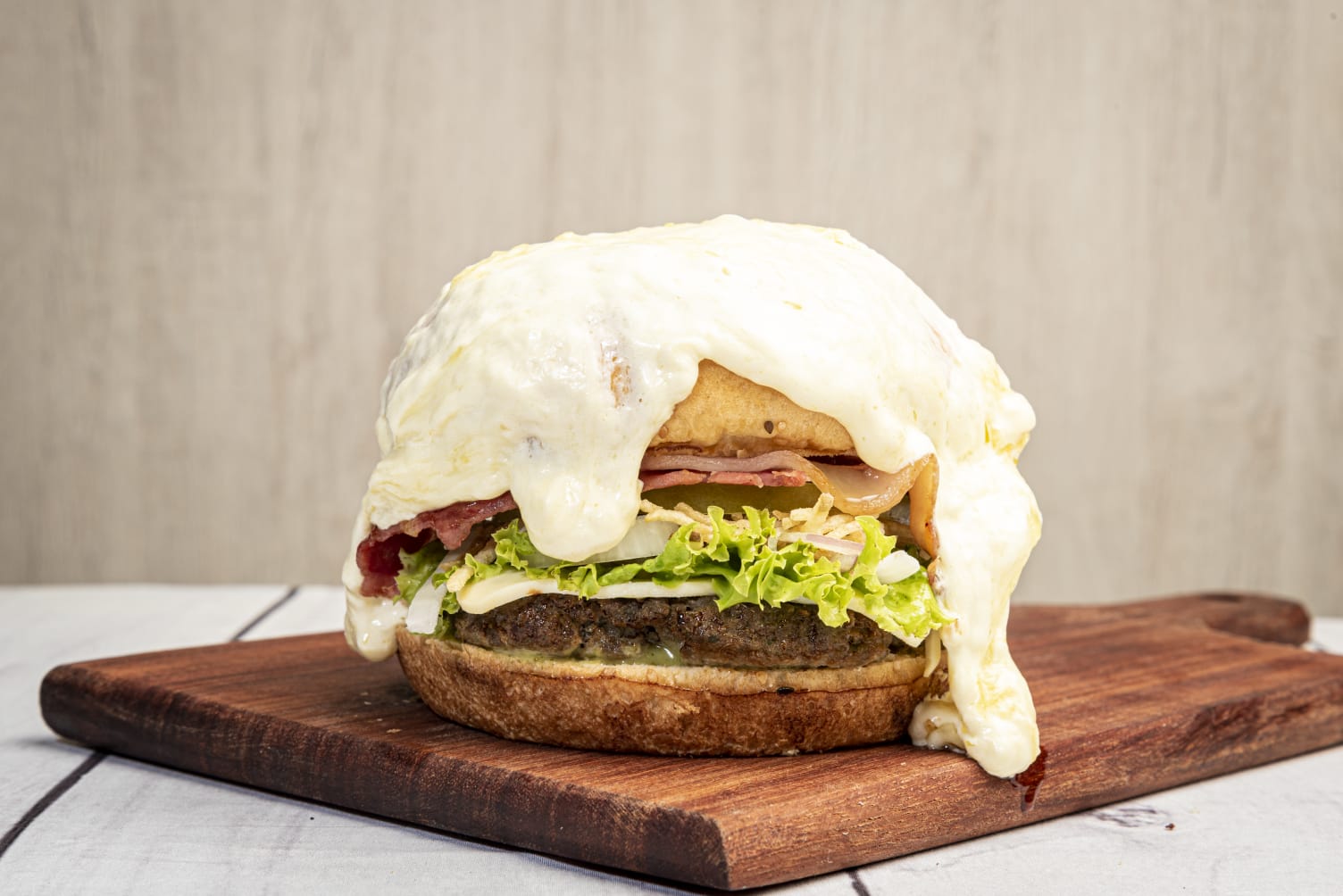 Doble carne angus 140 gamos, tocineta, pan con ajonjolí, doble queso mozzarella, jamón, ripio, lechuga, tomate, cebolla, salsas de la casa, salsa ahumada, salsa Boca'o.