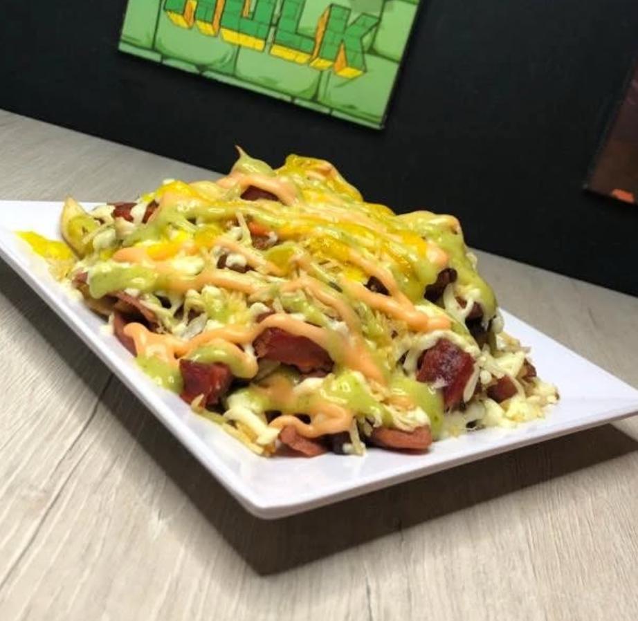 Papa francesa 210 g, 200 g salchicha, 3 quesos mozzarella, tocineta, lechuga, cebolla ensalsada, ripio y salsas.