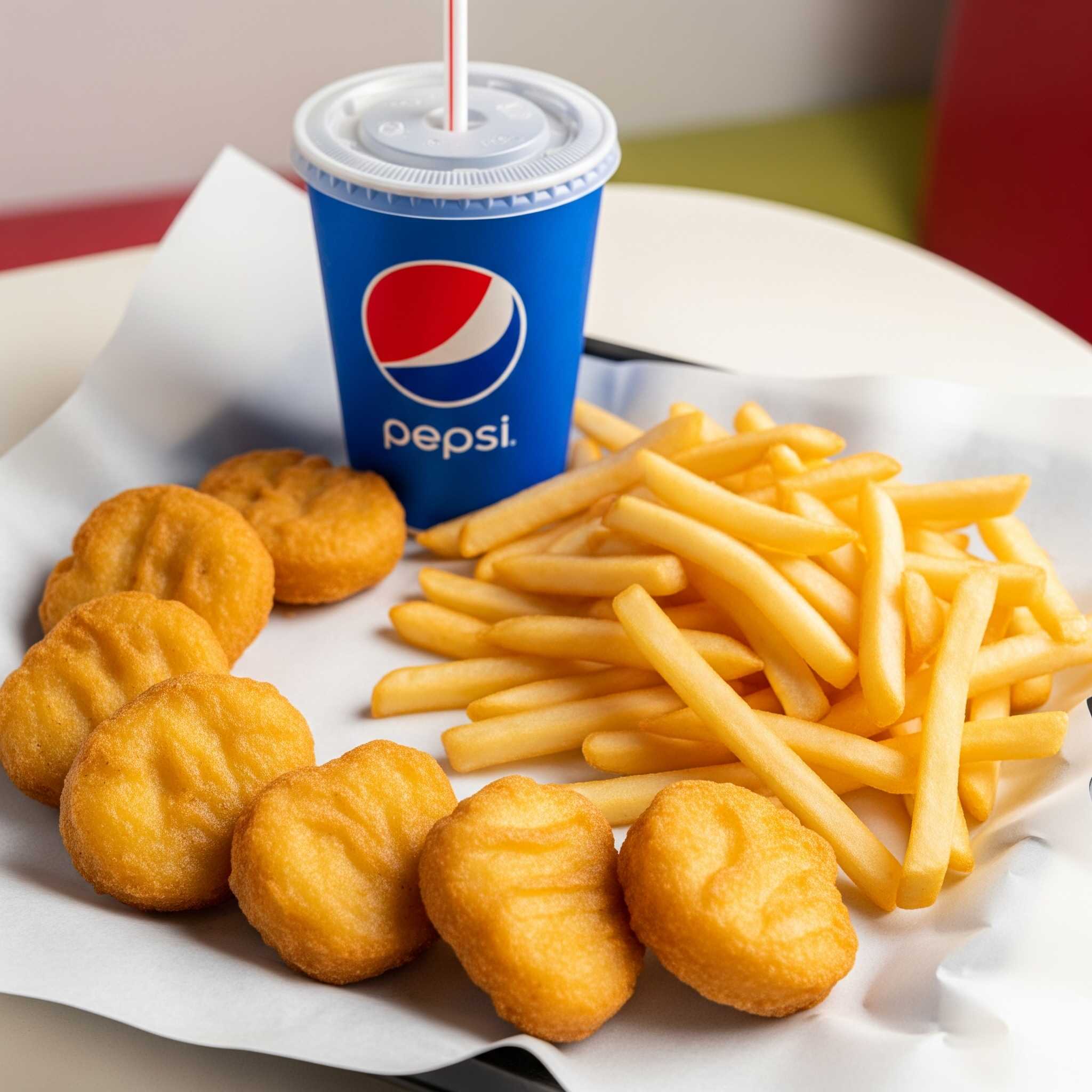 8 nuggets de pollo acompañado de 110 g papa francesa y gaseosa Postobón 250 ml.