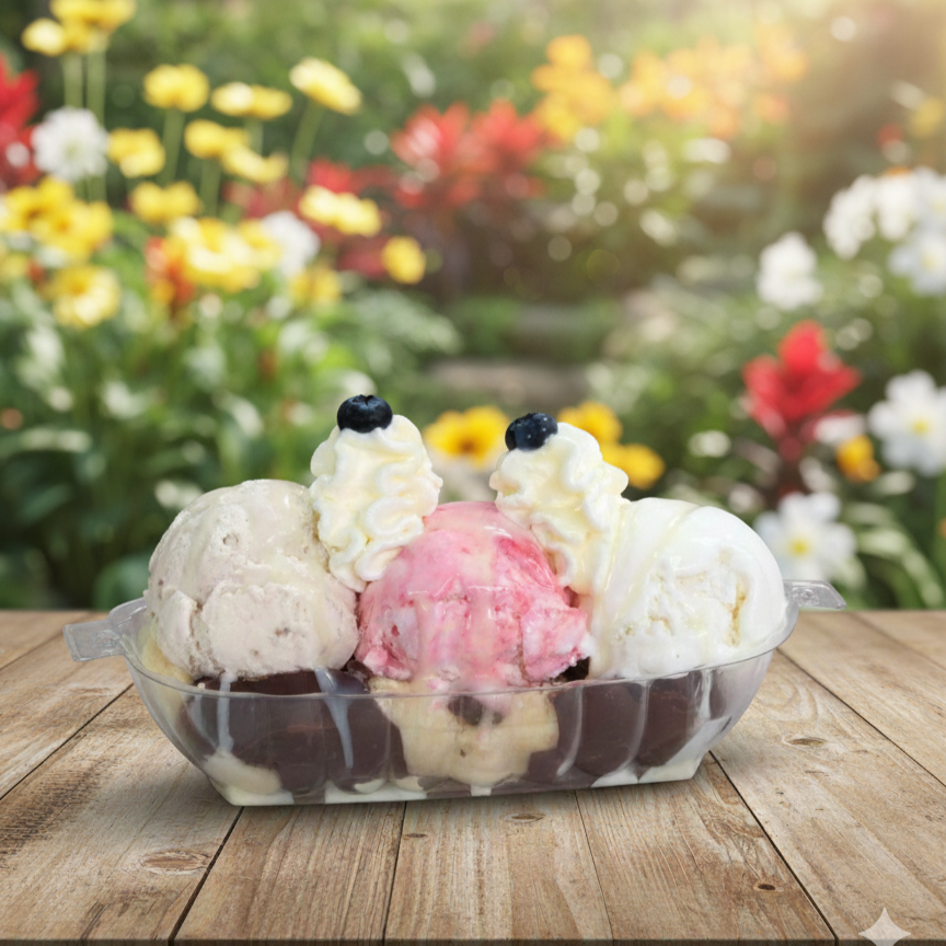 Postre de la casa con doble de todo: base helado de tu preferencia, terminado en crema chantilly, fresas, arándanos, topping más salsa y adicciones, presentación 14 oz.