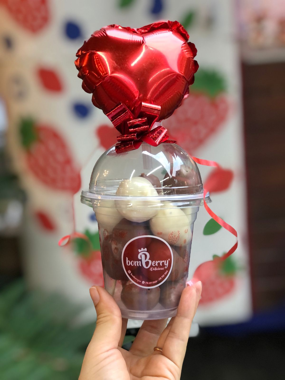 Snack de 200 g de fresas cubiertas de chocolate negro crujiente, presentación vaso 9 oz.