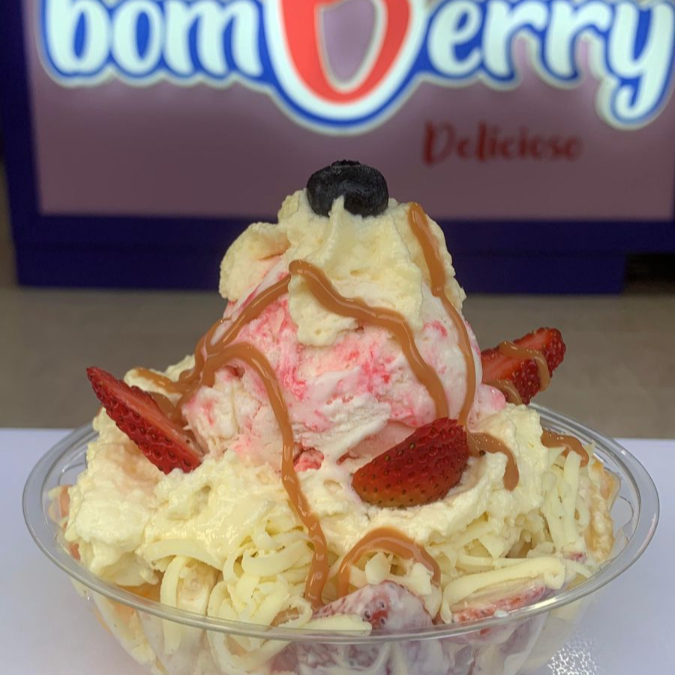Super combo con dos bomberry combinado súper el cual contiene postre de la casa con doble de todo: base helado, terminado en crema chantilly, fresas, arándanos, topping más salsa y adicciones, presentación 14 oz.