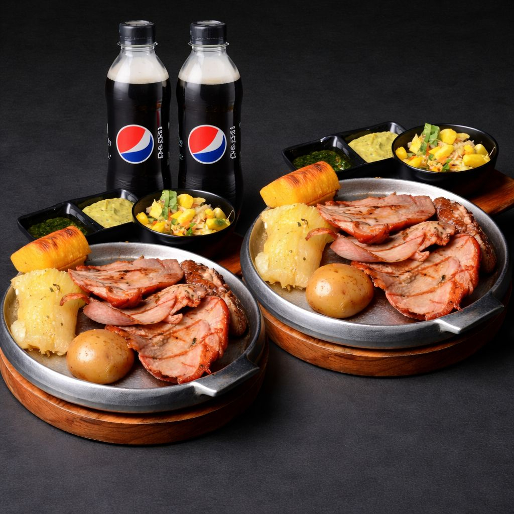 2 platos de nuestra jugosa y deliciosa Llanera Personal 300 g con papa cocida, ensalada y maduro, Acompañados de dos Gaseosa 250ml (el sabor de la gaseosa será enviado según disponibilidad)