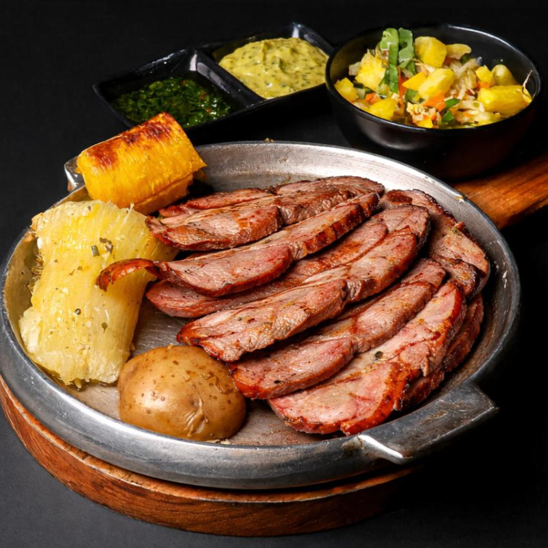 Carne de bondiola (300 g), papa al vapor, yuca, ensalada, chimichurri, salsa o guacamole.