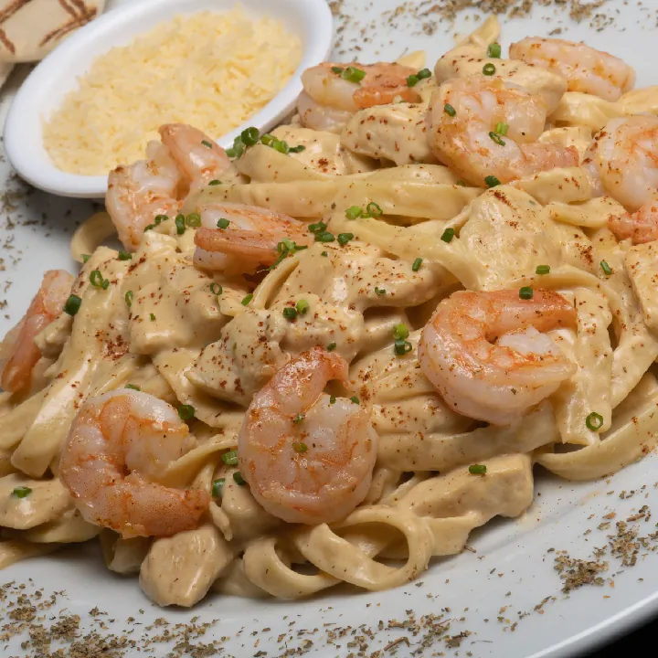 Deliciosa pasta fettuccini acompañada de camarones y trozos de pollo pan árabe crocante y queso parmesano.