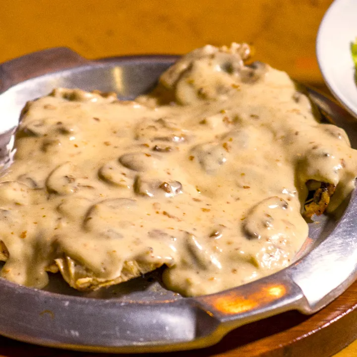 Delicioso filete de pollo en salsa de champiñones acompañado de puré de papa y ensalada de la casa.