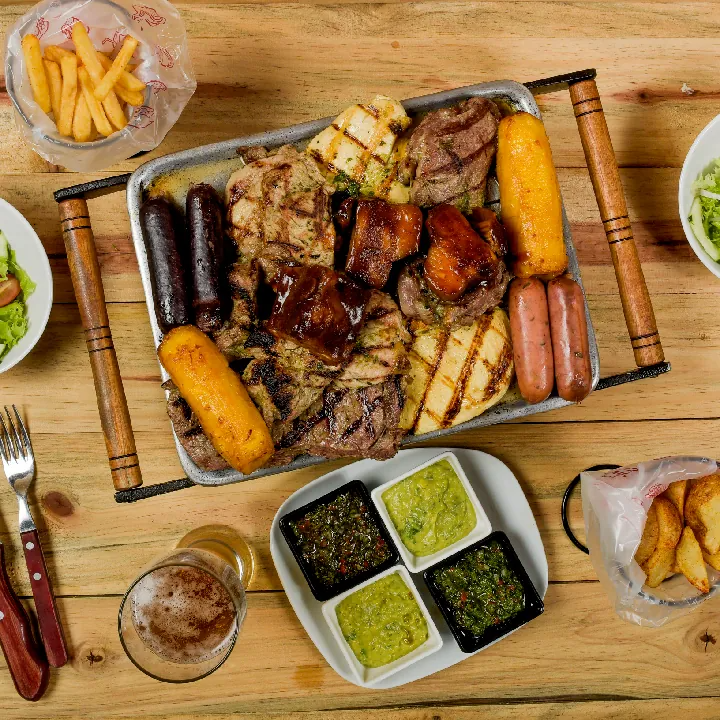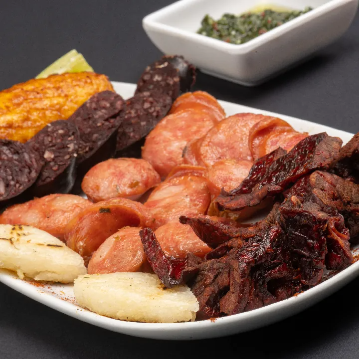 Acompañado de res bondiola costilla de cerdo pollo chorizo y morcilla acompañado de maduro y salsa de la casa.