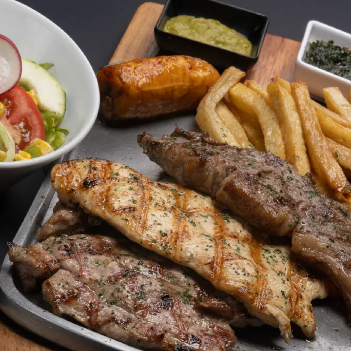 Deliciosa barbacoa acompañada de res cerdo y pollo acompañada de papas a la francesa maduro ensalada de la casa chimichurri y salsa de la casa.