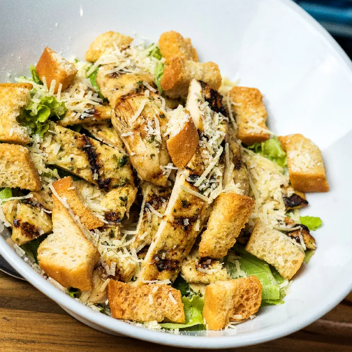 Una deliciosa cama de lechuga tomate cherry finos cortes de pechuga a la parrilla crotones lluvia de queso parmesano y aderezo césar de la casa.