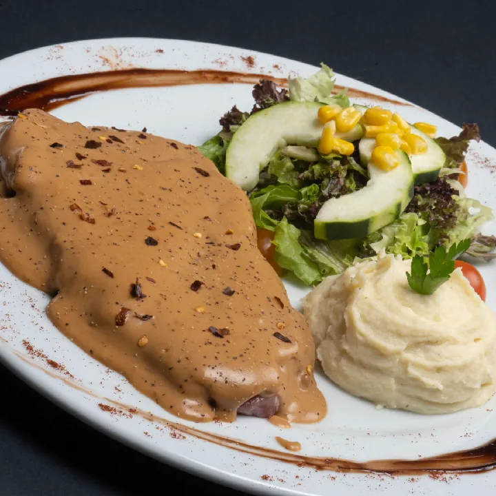 Delicioso lomo a la parrilla bañado en salsa de pimienta acompañado de puré de papa y ensalada de la casa.