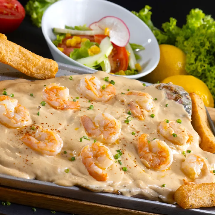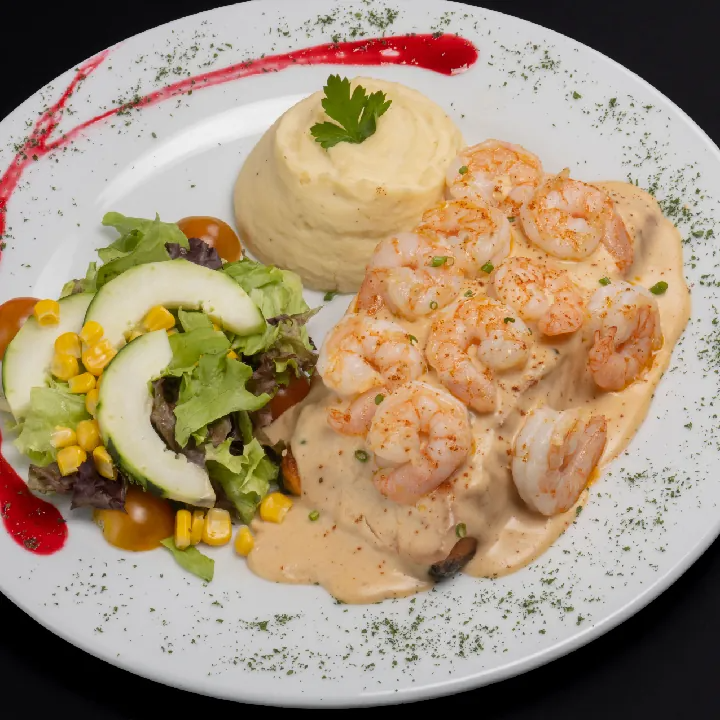 Delicioso salmón en salsa de camarones salteados acompañado de puré de papa y ensalada de la casa.