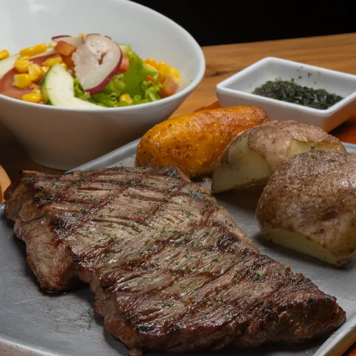 Deliciosa baby beef acompañada de papa al vapor maduro ensalada de la casa chimichurri y salsa de la casa.