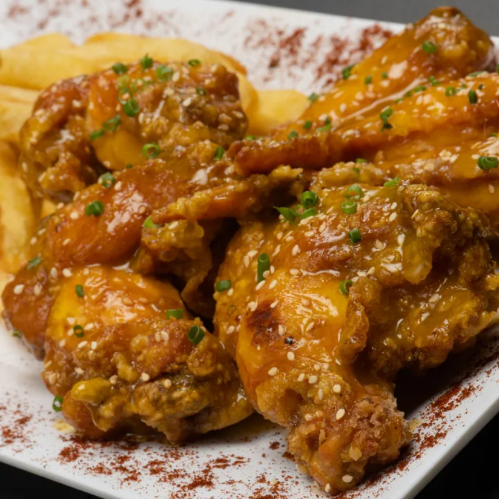 6 Deliciosas alitas en salsa de miel mostaza acompañadas de papas a la francesa.