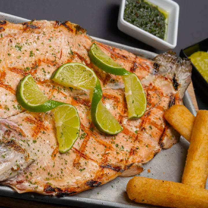 Deliciosa trucha a la parrilla acompañada de palitos de yuca y ensalada de la casa.