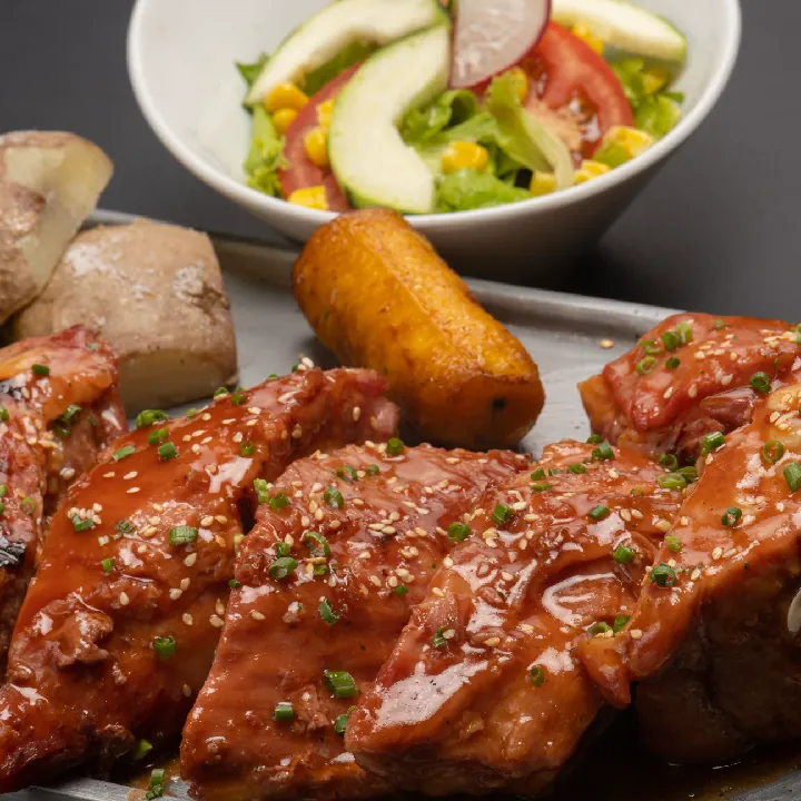 Deliciosas costillas a la BBQ acompañadas de papa al vapor maduro y ensalada de la casa.